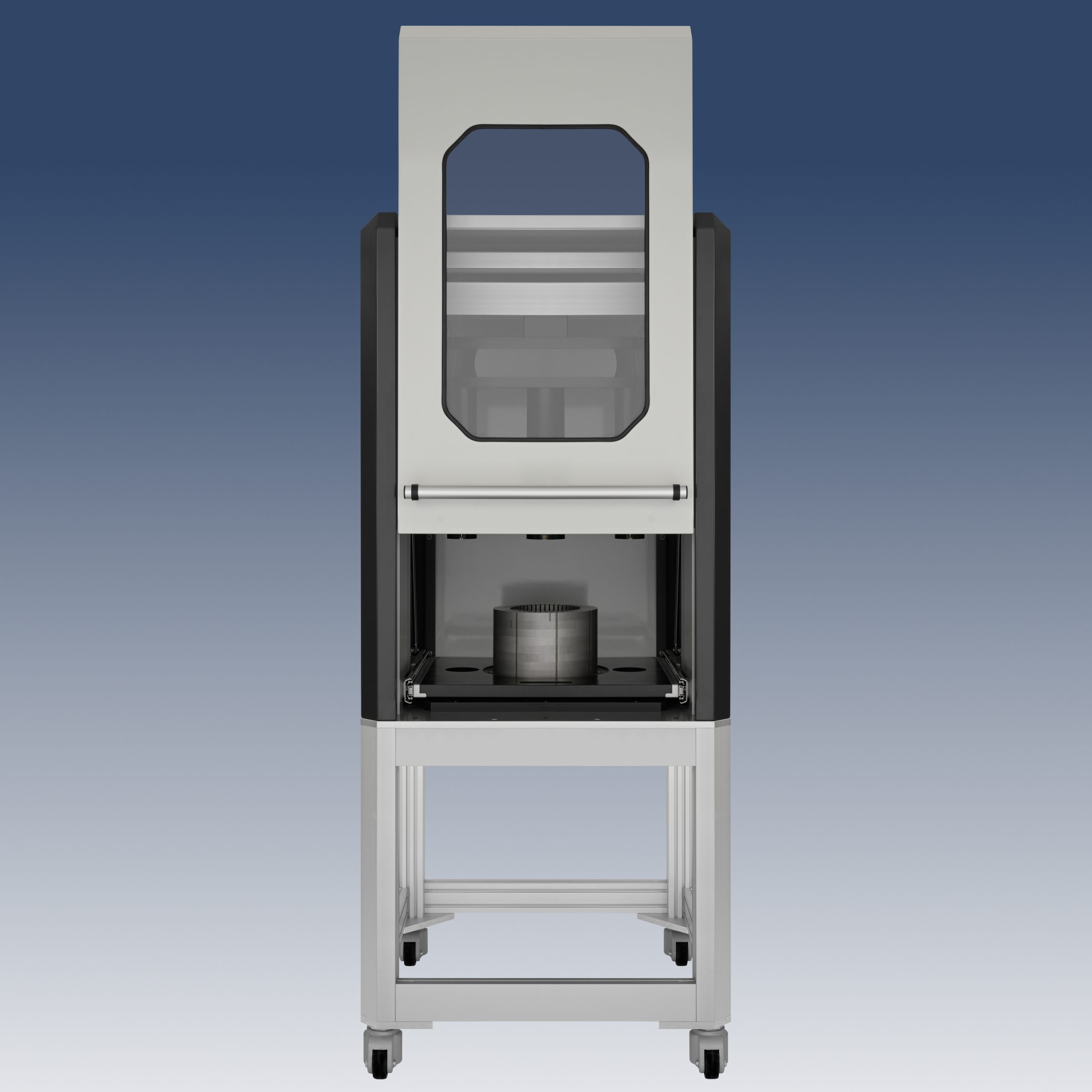 The testing station consists of a testing cage made from aluminium profiles. The front section is fitted with a safety light shield. This guarantees very quick operating processes. The stator package is fixed via a horizontal drill hole into a small prism. When the area of the safety light barrier is clear the testing process can be started by using the start button. Then a u-shaped bracket with 64 windings moves into the stator and makes contact with the opposite side. The measurement is started with a start signal. If the measuring result is positive (the stator corresponds to the norm) the u-shaped bracket recedes and the measuring sample can be removed. If the result is negative (the stator does not meet the norm) the u-shaped bracket remains closed – a lamp lights up – and can only be released by activating a switch manually.